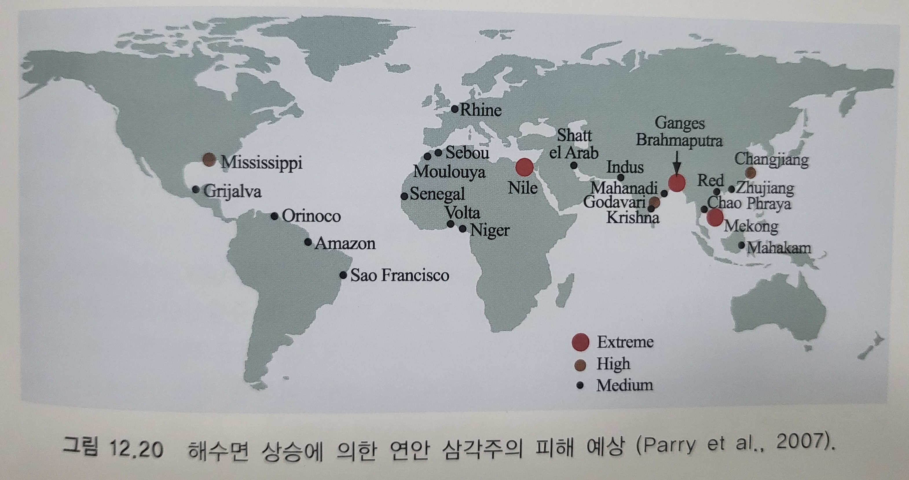 기후변화가 해양환경에 미치는 영향은 바닷물의 온도 상승과 열팽창, 해수면 상승, 해양의 산성화, 영구 동토와 극지방의 해빙 소실, 열대성 저기압 및 폭풍의 강화 등 다양하다. 이러한 영향 하에 놓여있는 연안의 인구 밀집 지역, 저지대와 삼각주, 군소 도서 및 산호초는 특히 취약하다. 대도시들의 대부분은 연안에 근접해 있고 인구밀도가 높은 농업지역은 큰 강의 삼각주에 형성돼 있다. 지구 온난화의 가장 확실한 효과 가운데 하나인 해수면 상승이 향후 수 세기 동안에도 지속될 것으로 보고 있기 때문에, 연안의 저지대와 삼각주는 해수의 범람과 홍수의 위험 및 강풍을 동반한 폭풍의 악영향 등에 노출된 가능성이 높다. 배출전망치 상 지구의 기온이 3℃ 정도 상승하는 2080년경에는 전 세계 인구의 1500만 명 이상이 홍수의 위협에 처하고 연안의 30% 이상은 유실될 가능성이 있다. 그림 12.20은 2050년에 해수면 상승으로 인해 연안 삼각주에서 발생할 수 있는 피해 예상 인구를 보여준 것이다. 극한(extream)경우는 인구 백만 명 이상, 높은(high) 경우는 백만에서 50000명 그리고 보통(medium)인 경우는 50000에서 5000명이 피해를 볼 것으로 예상된다. 가장 많은 인구가 거주하고 있는 방글라데시의 갠지스-브라마푸트라 삼각주, 베트남의 메콩 삼각주 그리고 이집트의 나일 삼각주는 극심한 경우이다.
